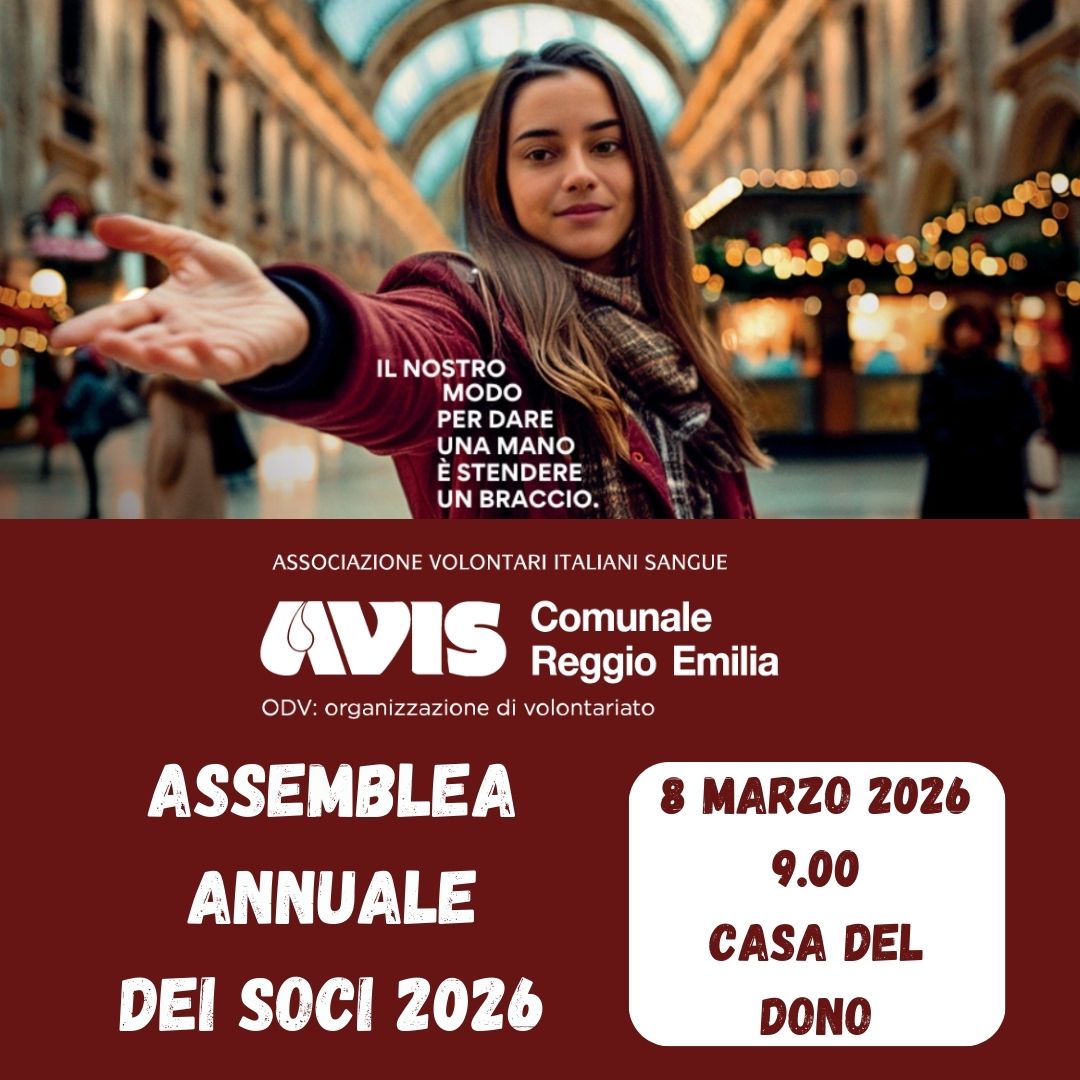Il Presidente, preso atto di quanto deliberato dal Consiglio Direttivo dell’Avis Comunale di Reggio Emilia nella riunione del 11/12/2025 ha deliberato di convocare l’Assemblea degli Associati dell’Avis Comunale a Reggio Emilia presso la Casa del Dono per: